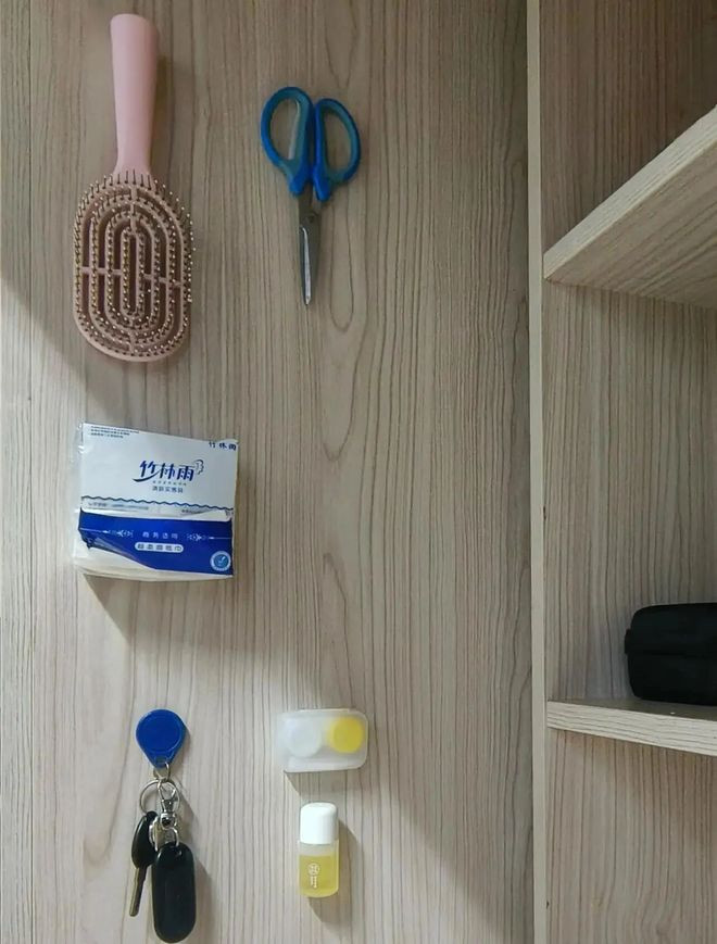 不管是纸巾、钥匙、剪刀全给它摁上去,一目了然,哪儿拿的用完还得摁回哪儿,想丢都难!背胶魔术贴直接隐形,算是深藏功与名了!