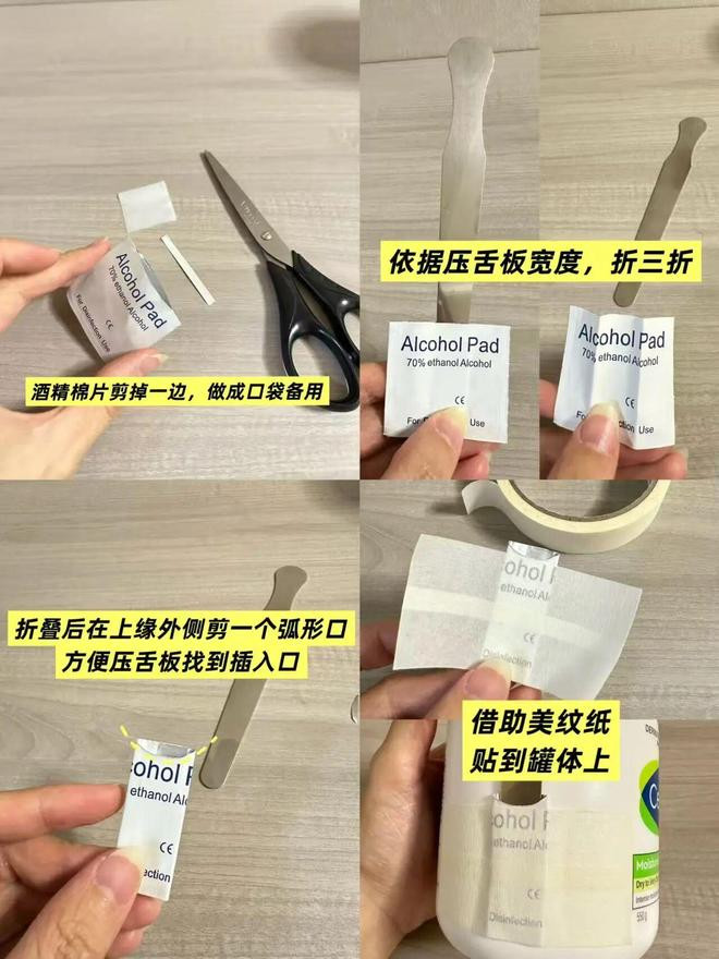 方法很简单,拆个酒精棉片,顺便给压舌板消消毒,再把包装袋根据压舌板宽度折三折,相当于为它量身打造个单间。