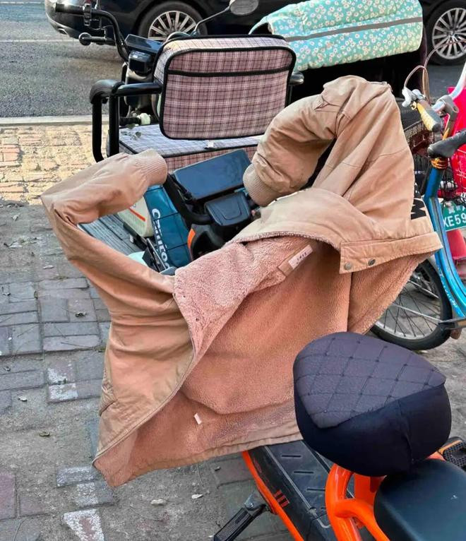 还有网友不穿的旧棉衣下岗再就业,化身电动车防寒铠甲。