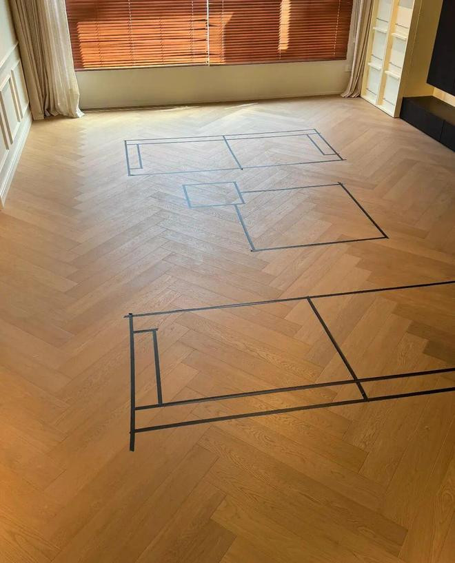 聪明的住友@睿哥带上一卷美纹纸,把家具占地面积框出来,算是低成本验证尺寸了!
