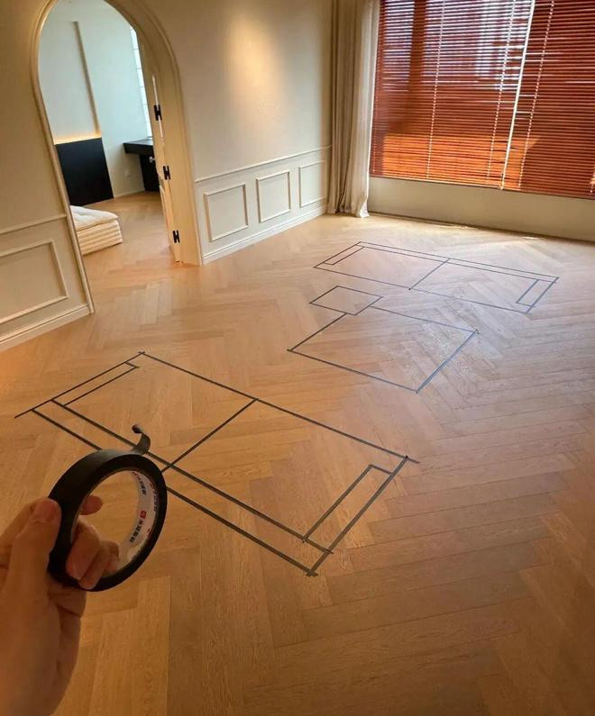 这招真的太灵了!美纹纸易撕不留痕,在地上贴出家具的轮廓,长宽高是否合适,走路会不会挡道,一眼看清!