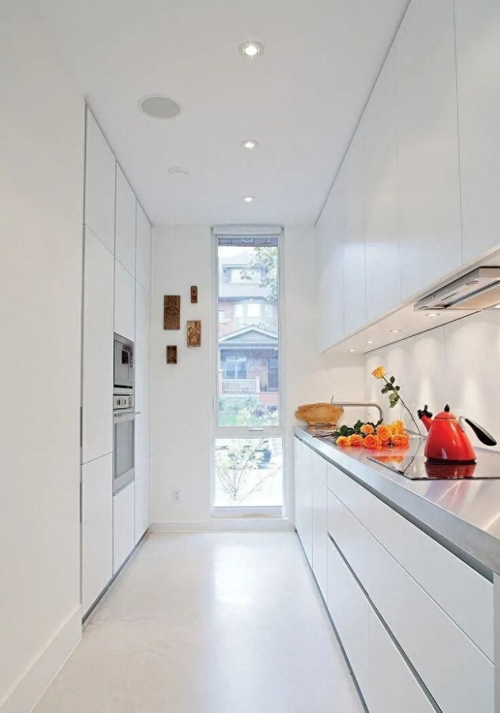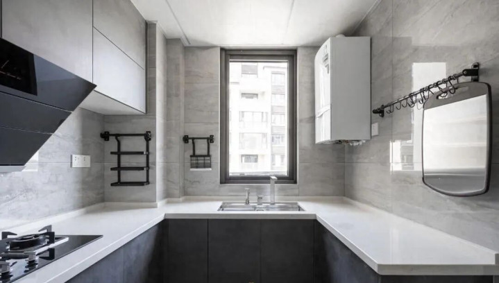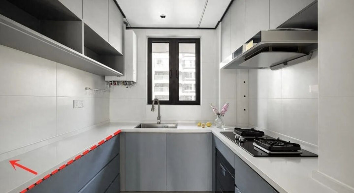 厨房台面宽度一般在50~60cm之间更为合适,如果厨房小,U型布局后难免挤占了更多的活动空间,考虑到实际情况,可局部对台面做出调整:
