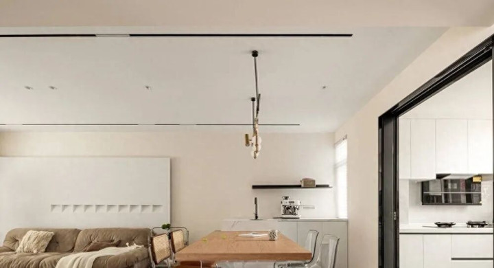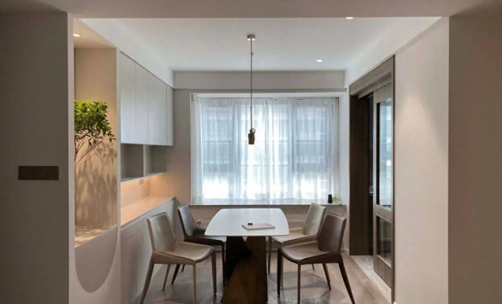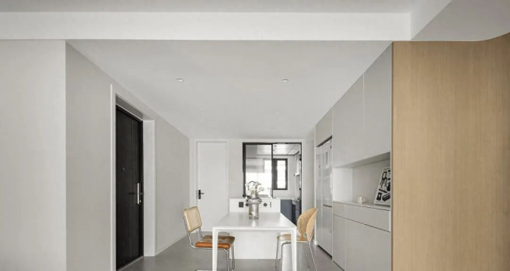 除了餐边柜,也能设岛台餐桌,一体化后更省地,岛台下可用来收纳,其上台面也能酌情考虑增设水槽,缓解小厨房的使用压力。